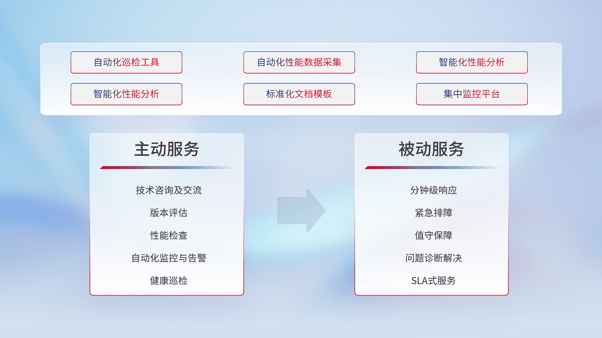 智能化工具和标准化文档,,,保障服务质量,,,提供主动服务(包含技术咨询、、、、版本评估、、、性能检查、、、、自动化监控与告警、、、健康巡检)和被动服务包含(分钟级响应、、、紧急排障、、、、值守保障、、、、问题诊断解决、、SLA服务)。。。
