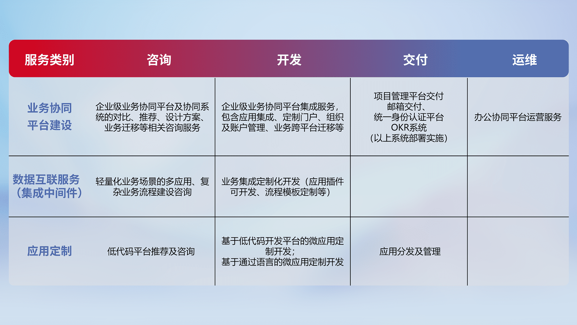 针对钉钉、、企微、、IDaas等平台级产品提供产品的规划、、方案、、、交付、、、、定制化开发等服务,,实现如统一协同办公、、智能客户服务、、、、混合会议管理、、、智能数据查询、、、等业务场景,,实现数字化转型。。。。